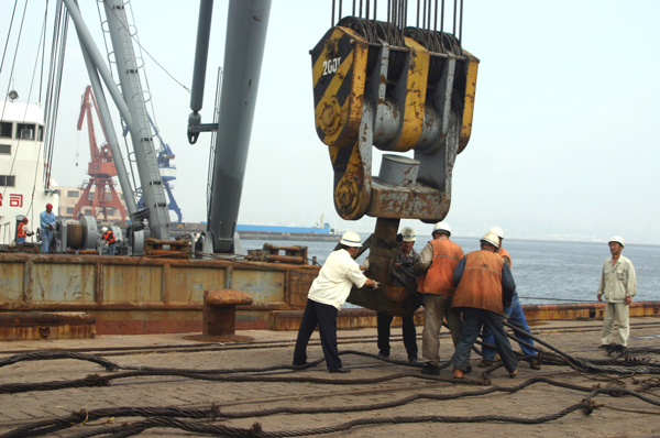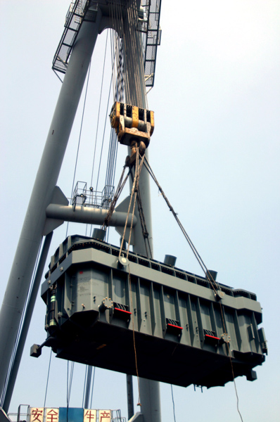 由于門機(jī)不能起吊這樣的大型設(shè)備,所以有關(guān)部門聯(lián)系到海吊,進(jìn)行裝船作業(yè)。不要以為海吊來了就萬事大吉了,往這個(gè)負(fù)荷200T的大鉤頭上掛鋼絲繩就十分麻煩?! ?/p>