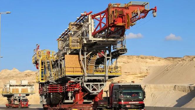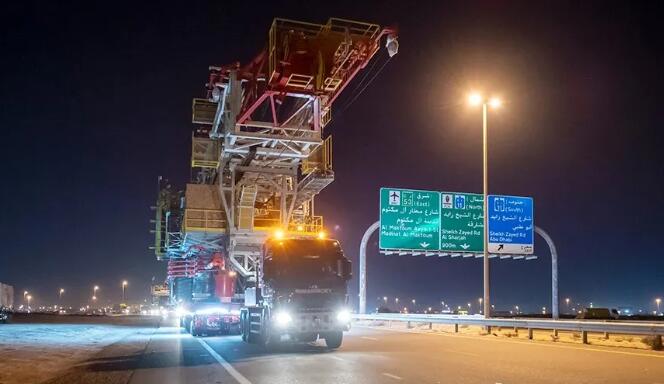 運輸前需要進行的準(zhǔn)備工作包括對道路基礎(chǔ)設(shè)施進行改造,臨時替換100多個路燈和交通信號燈,建造臨時橋梁以保護地下電纜和管道。每個鉆機包括三個主要部分和三個較小的部分,重量從147噸到471噸不等。它們在杰貝阿里自由區(qū)的制造廠用大件運輸車運輸至杰貝阿里港,然后在港口裝載到Mammoet駁船上,再通過水路運輸?shù)桨⒙?。最后在杜克姆港接收并裝載進行陸運,鉆機段被運送到Nimr現(xiàn)場400公里。