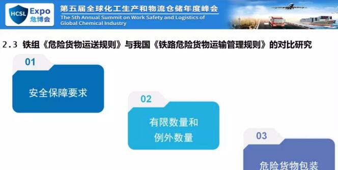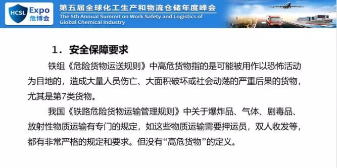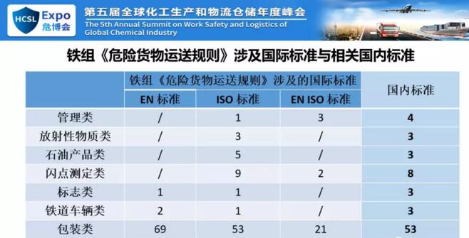 這是我們否它的主要原因,我們認(rèn)為你不能大量的引用歐盟標(biāo)準(zhǔn),你可以引用內(nèi)容,因為內(nèi)容可以直接摘過來,但是不能直接引用,直接引用我們沒法執(zhí)行,所以主要原因是在這兒。下面我說一下咱們的規(guī)則,鐵組的危險貨物規(guī)則和國家的鐵路運危險貨物運輸管理規(guī)則。一個是近期我們受到征求意見稿就是叫高危貨物或者高?;瘜W(xué)品,對我們來說高危貨物,但是鐵路的運輸規(guī)則和橘皮書里面早就有高危化學(xué)品,但是我們的域值差別很大。我國鐵路危險貨物運輸管理規(guī)則中有各種爆炸品、氣體、劇毒品、放射性物質(zhì)有專門規(guī)定,但是沒有高危貨物的定義。