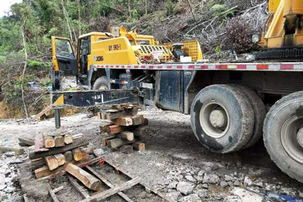 第三步:確認(rèn)吊車支腿安全,吊車支腿應(yīng)完全打開,支腿下方應(yīng)墊上枕木或鋼板。