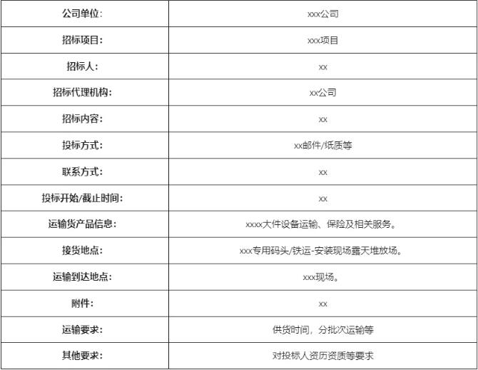 廣告和邀請(qǐng)函的內(nèi)容大體相同,主要包括:運(yùn)輸方的單位名稱、地址;發(fā)運(yùn)物件名稱;招標(biāo)的有關(guān)信息(招標(biāo)文件號(hào)或名稱,所運(yùn)物件的參數(shù)說(shuō)明,運(yùn)輸?shù)奶厥庖螅\(yùn)輸?shù)钠鹗嫉睾湍康牡?,運(yùn)輸時(shí)間);招標(biāo)文件的價(jià)格、以及開(kāi)始出售招標(biāo)文件的時(shí)間;報(bào)送投標(biāo)書時(shí)間、地點(diǎn),及投標(biāo)截止期限;投標(biāo)保證金金額;對(duì)投標(biāo)人的資格要求。